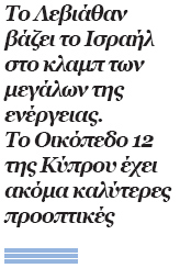 Η πρόσφατη ανακοίνωση της Noble Energy από το Τέξας και των συνεταίρων της για τη μεγάλη ανακάλυψη του πεδίου Λεβιάθαν, στα ανοιχτά του Ισραήλ, αυτόματα αναβαθμίζει τη χώρα και τη βάζει στο κλαμπ των μεγάλων παικτών του τομέα της ενέργειας, κάτι που κανείς δεν μπορούσε να φανταστεί πριν από μερικά χρόνια. Με βάση την αμερικανική μέθοδο υπολογισμού των αποθεμάτων του Λεβιάθαν αλλά και του γειτονικού πεδίου Ταμάρ, το Λεβιάθαν φτάνει τα 25 τρισ. κυβικά πόδια.