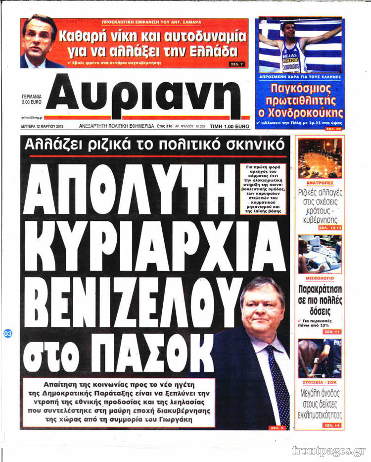 Βέβαια, ο γνωστός παραγωγός μπορεί να γιόρταζε και την "Απόλυτη κυριαρχία Βενιζέλου στο ΠΑΣΟΚ", όπως έσπευσε να κάνει μέσα από το εξώφυλλο της Αυριανής. (δείτε δίπλα τη φώτο από το διθυραμβικό για το "Μπένι" εξώφυλλο της Αυριανής και...βγάλτε τα συμπεράσματά σας)...