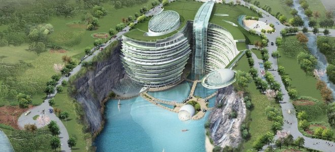 Ενα άκρως εντυπωσιακό και μοναδικό ξενοδοχείο κατασκευάζεται στην Κίνα, μέσα στο κοίλωμα ενός εγκαταλελειμμένου ορυχείου... Η μοναδικότητά του έγκειται στο γεγονός ότι οι από τους 19 συνολικά ορόφους του, μόνο οι τρεις θα βρίσκονται πανω από την επιφάνεια του εδάφους, ενώ οι υπόλοιποι 16... κάτω από αυτή!...