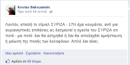 «Λοιπόν, επειδή το σίριαλ ΣΥΡΙΖΑ - 17Ν έχει κουράσει, αντί για αυριανιστικές επιθέσεις ας δεσμευτεί η ηγεσία του ΣΥΡΙΖΑ οτι ποτέ - μα ποτέ- δεν θα εισηγηθεί ή δεν θα αποδεχθεί αμνήστευση ή μείωση της ποινής των δολοφόνων. Απλό δεν είναι;».