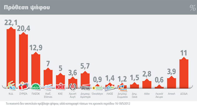 Στην δημοσκόπηση που δημοσιεύει το «ΠΡΩΤΟ ΘΕΜΑ», στην εκτίμηση ψήφου επί των εγκύρων η ΝΔ συγκεντρώνει 23,1%, ο ΣΥΡΙΖΑ 21,4%,το ΠΑΣΟΚ 13,5%, οι Ανεξάρτητοι Έλληνες 7,3%, ΤΟ ΚΚΕ 5,2%, η Χρυσή Αυγή 5,2% και η ΔΗΜΑΡ 6%. Αλλα κόμματα δηλώνει ότι θα ψηφίσει το 7,7% και οι αναποφασιστοι φθάνουν το 12%.