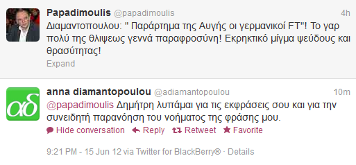 Ένα twittάρισμα της Αννούλας ήταν αρκετό για να ξεσπάσει σκληρή κόντρα μεταξύ της Άννας Διαμαντοπούλου και του Δημήτρη Παπαδημούλη σχετικά με τη δήλωση της πρώην υπουργού για το δημοσίευμα των γερμανικών Financial Times.