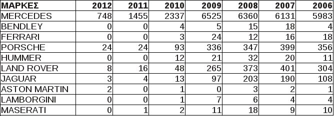 Οπως είναι φυσικό αντίστοιχη είναι και η μείωση των αυτοκινήτων που χαρακτηρίζονται πολυτελείας. Είναι χαρακτηριστικό ότι όλο το 2001 και το 2012 -έως τώρα τουλάχιστον- δεν έχει πουληθεί ούτε ένα αυτοκίνητο από μάρκες όπως η Bendley, η Ferrari, η Hummer, η Maserati και η Lamborgini.