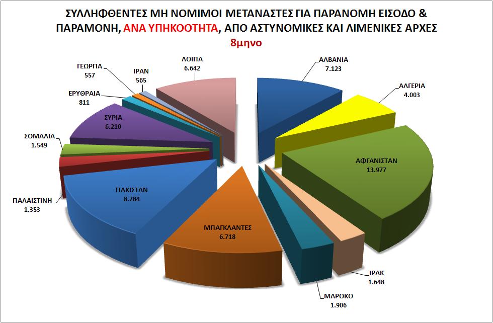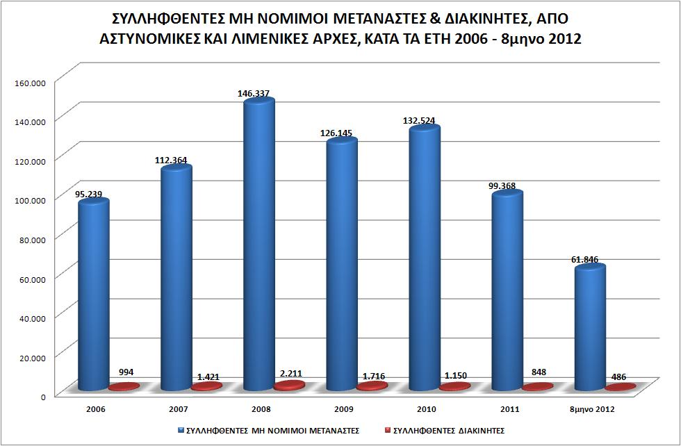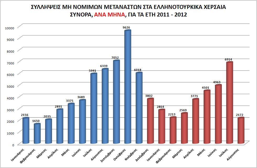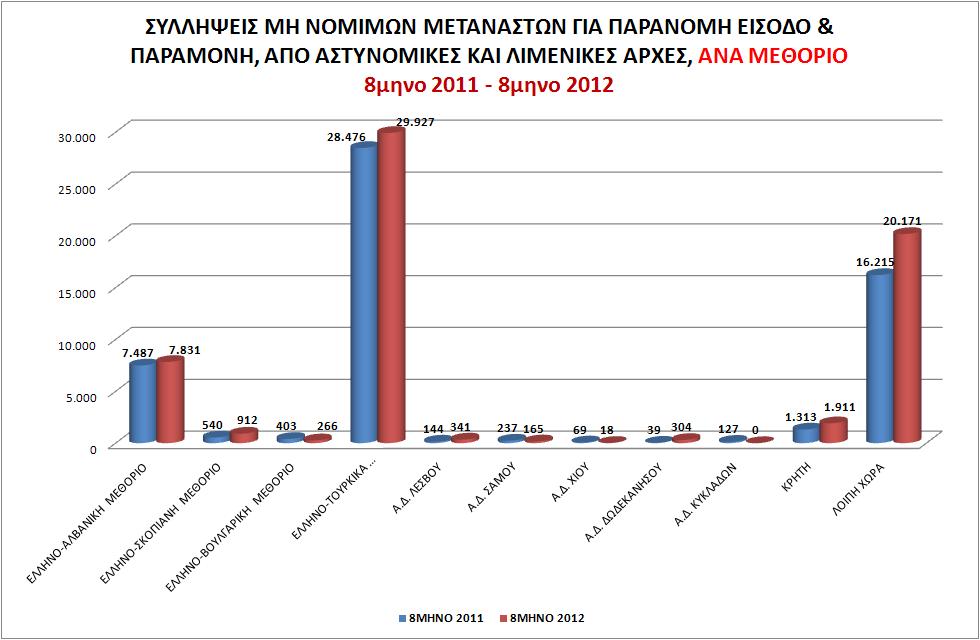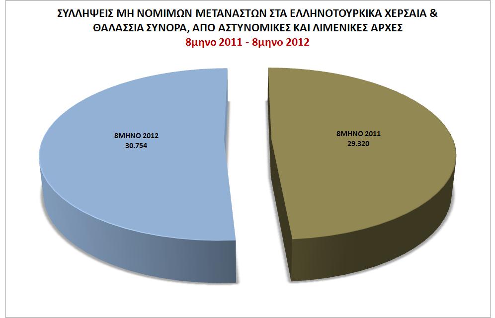 Στους πρώτους οχτώ μήνες του 2012 στην χώρα μας από τα ελληνοτουρκικά σύνορα, ήρθαν 30.754 μετανάστες και συνελήφθησαν και απελάθηκαν συνολικά 9.963.