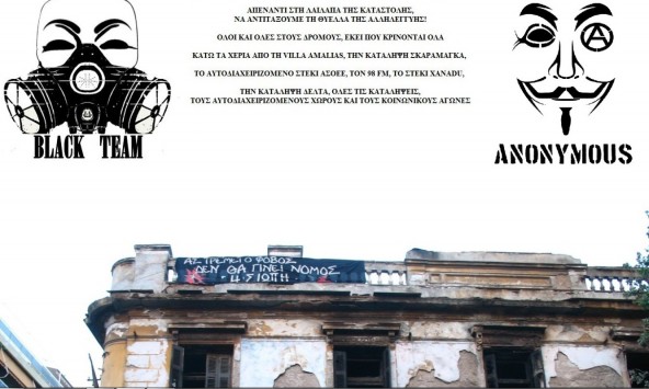 "Απένταντι στη λαίλαπα της καταστολής να αντιτάξουμε τη θύελλα της αλληλεγγύης". Αυτό και άλλα συνθήματα έχουν γράψει οι χάκερς στη φωτογραφία που έχουν ανεβάσει στο site της εφημεριδας Αδεσμευτος Τύπος στην οποία απεικονίζεται η Βίλα Αμαλίας.