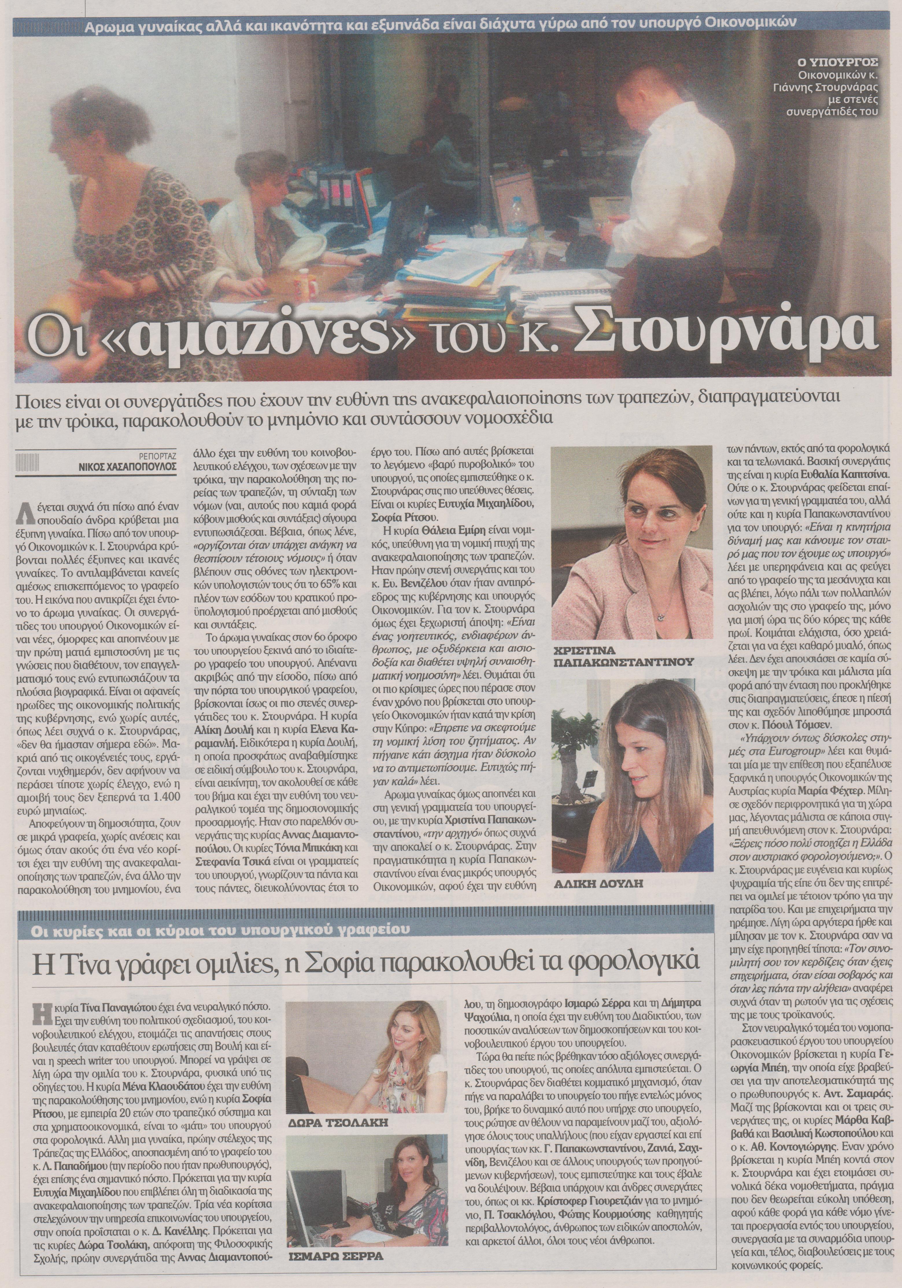 Γραμματείς του υπουργού είναι η Τόνια Μπικάκη και η Στεφανία Τσικά, οι οποίες γνωρίζουν τους πάντες και τα πάντα, διευκολύνοντας τον κ. Στουρνάρα, ενώ στις πιο υπεύθυνες θέσεις του υπουργείου βρίσκονται η Σοφία Ρίτσου και η Ευτυχία Μιχαηλίδου.