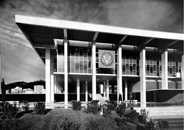 Ο ίδιος ο Γκρόπιους έλεγε πως το σχέδιό του για την πρεσβεία των ΗΠΑ στην Αθήνα -η ανέγερση διήρκησε από το 1959 ως το 1961- είχε ως πηγή έμπνευσης την αρχιτεκτονική του Παρθενώνα (κολόνες εμπνευσμένες από το μνημείο και με πεντελικό μάρμαρο). Ο Γκρόπιους πίστευε ότι η μορφή κάθε κτιρίου θα πρέπει να ανταποκρίνεται στις ανάγκες που καλύπτει και στις λειτουργίες που επιτελεί. Ετσι οι ανοικτοί χώροι της πρεσβείας ήταν μεγάλοι, οι κήποι και τα σιντριβάνια ελεύθερα στη δημόσια θέα. Το κτίριο γινόταν έτσι ένα σύμβολο της «ανοικτής κοινωνίας», των δημοκρατικών θεσμών και αξιών των Ηνωμένων Πολιτειών.