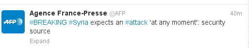 Η Συρία αναμένει «ανά πάσα στιγμή» μία επίθεση κατά του εδάφους της από τις δυτικές δυνάμεις, υπογράμμισε σήμερα στο Γαλλικό Πρακτορείο ανώτατος αξιωματικός των δυνάμεων ασφαλείας της χώρας.