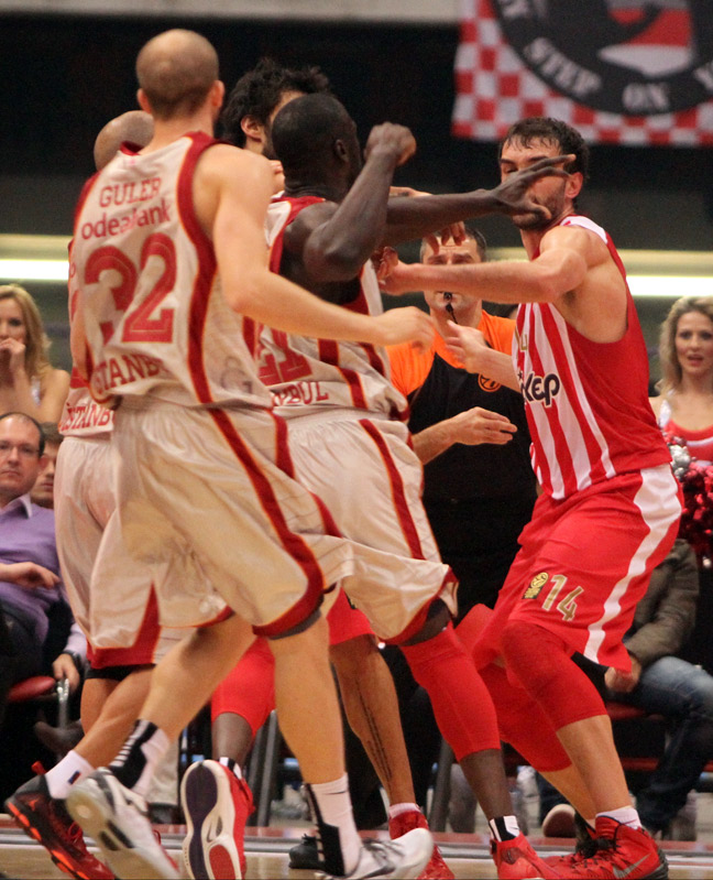 Ο Ολυμπιακός είχε ήδη καπαρώσει τη νίκη και το ρεκόρ. Τα δέκα λεπτά που απέμεναν ήταν διαδικαστικά. Ο Ντάνστον επανήλθε σαν να μην έλειψε ποτέ και η διαφορά έφτασε γρήγορα στους 26 (67-41), την ώρα που ο Εργκίν Αταμάν πετούσε λευκή πετσέτα. Το ήσυχο βράδυ χάλασε τρία λεπτά πριν το τέλος και με το σκορ 70-46, όταν Μπέγκιτς και Μενσά-Μπονσού ήρθαν στα χέρια με τον Βρετανό σε έξαλλη κατάσταση να πετά γροθιές δεξιά και αριστερά. Το ΣΕΦ πήρε φωτιά με οπαδούς να επιχειρούν «ντου» και τους δύο πρωταγωνιστές του επεισοδίου, μαζί με τον Πρίντεζη, να αποβάλλονται με ντισκαλιφιέ. Τα πνεύματα ηρέμησαν μετά από πάνω από δέκα λεπτά και αφότου ο Μενσά-Μπονσού αποχώρησε από διαφορετική έξοδο από το παρκέ. Το τελικό 72-54 έγραψε τον επίλογο σε μία βραδιά που είχε άσχημη κατάληξη.