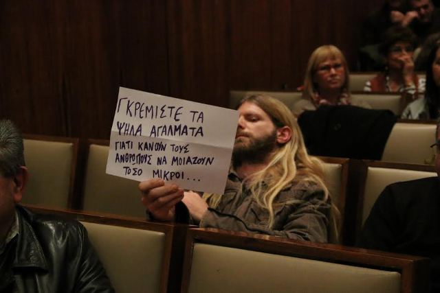 Ένας άλλος παρευρισκόμενος έβγαλε ένα χαρτί που έγραφε «Γκρεμίστε τα αγάλματα γιατί κάνουν τους ανθρώπους να μοιάζουν τόσο μικροί...».