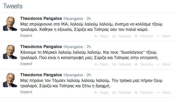Λαλούμ, λαλούμ, λαλούμ και τζουμ τριαλαρό... Δεν είναι μέρος ενός παιδικού ποιήματοςαλλά του πολιτικού τρίστιχου που ανέβασε ο Θόδωρος Πάγκαλος στο twitter.
