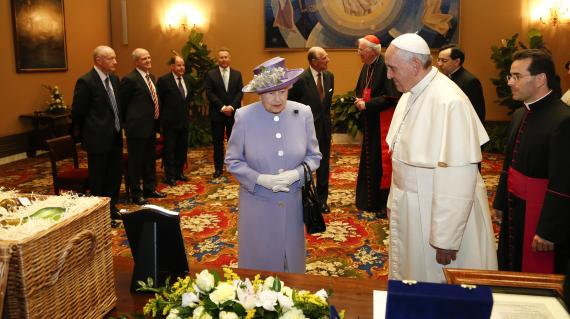 Η βασίλισσα και ο πρίγκιπας Φίλιππος, ο Δούκας του Εδιμβούργου, συνάντησαν τον Πάπα σε ένα δωμάτιο με μοντέρνα διακόσμηση δίπλα από την αίθουσα ακροάσεων του Βατικανού, χωρίς την τελετουργική μεγαλοπρέπεια που συνήθως είναι ίδιον αυτού του είδους των επισκέψεων.