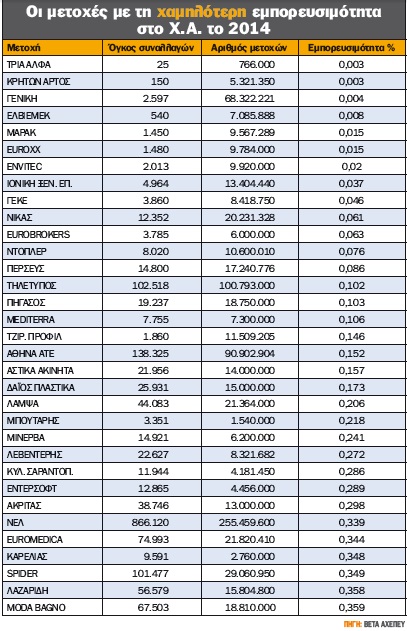 Η χαμηλή εμπορευσιμότητά τους μπορεί να οφείλεται είτε στην υπερσυγκέντρωση από τους βασικούς μετόχους, όπως συμβαίνει στις μετοχές των ξενοδοχειακών ομίλων, των ακινήτων και των ΜΜΕ, η εμπορευσιμότητα των οποίων εξαντλείται φέτος στο 0,02% έως το 0,1% των μετοχών τους (ΓΕΚΕ, Ιονική Ξενοδοχειακή, Αστήρ Παλλάς, Αστικά Ακίνητα, Λάμψα, Τηλέτυπος, Πήγασος κ.ά.), είτε αποκλειστικά στην απουσία ενδιαφέροντος από τους επενδυτές εξαιτίας των οικονομικών προβλημάτων ή του μικρού μεγέθους τους. Τέτοιες περιπτώσεις είναι μετοχές όπως η Euromedica, η Μπήτρος, οι Μινωικές, οι Μύλοι Κεπενού, οι Μύλοι Λούλη, ο όμιλος Ideal, η Byte, η Hellas On Line, η Attica Group και δεκάδες ακόμα.