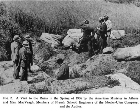 Επίσκεψη στον χώρο την άνοιξη του 1936 του αμερικανού υπουργού, μελών του Γαλλικού Σχολείου, μηχανικών και του Broneer