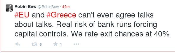 Ο Robin Bew, γενικός διευθυντής του EIU έγραψε σήμερα το πρωί στο twitter πως Ευρώπη και Ελλάδα δεν κατόρθωσαν καν να να συμφωνήσουν για τι θα πουν για τη συζήτησή τους. Αναφέρεται σε πραγματικό κίνδυνο bank run και ανεβάζει τις πιθανότητες εξόδου από το ευρώ στο 40%.