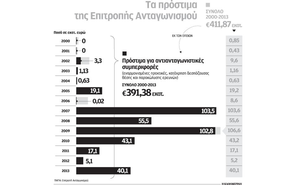 Από το 2000, οπότε ιδρύθηκε, έως το 2013 η Επιτροπή Ανταγωνισμού επέβαλε πρόστιμα που υπερβαίνουν τα 410 εκατ., ενώ τα τελευταία χρόνια η επαρκέστερη σε σύγκριση με το παρελθόν θεμελίωση των αποφάσεων της αρχής είχε ως αποτέλεσμα να εισπράττεται από το ελληνικό Δημόσιο ποσοστό που ξεπερνά το 65% του αρχικώς επιβληθέντος προστίμου.