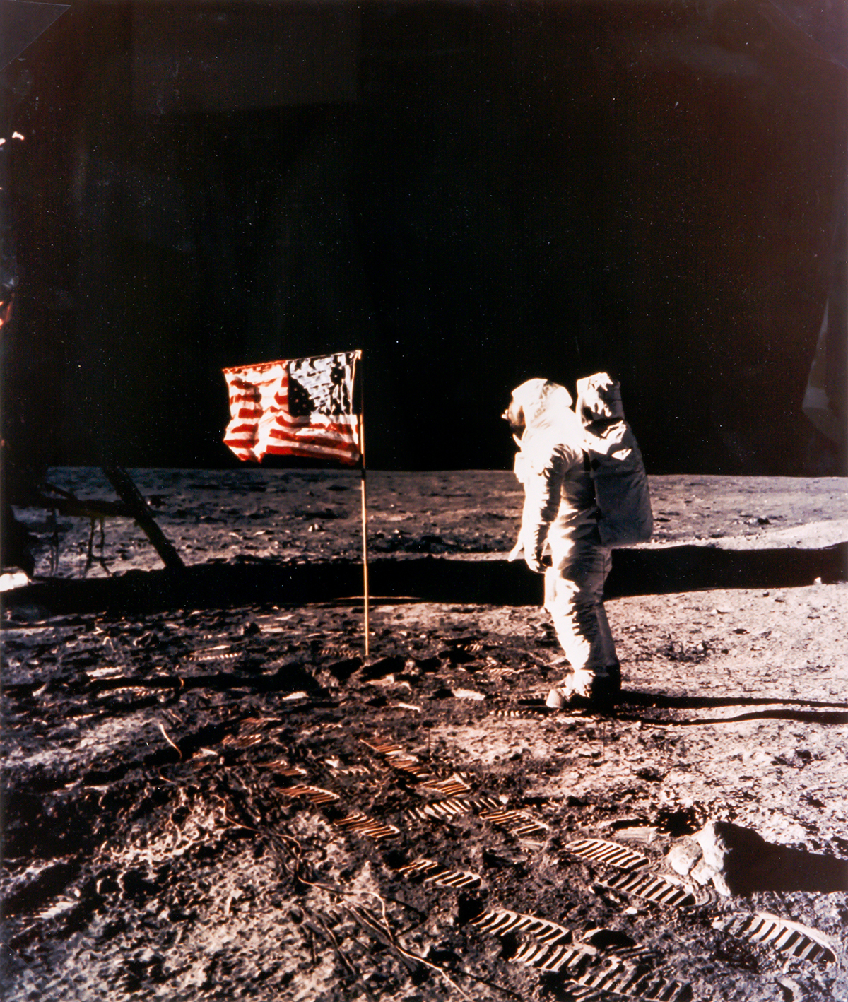 Η αμερικανική σημαία κυματίζει, καρφωμένη στο έδαφος της σελήνης. Ο αστροναύτης Μπαζ Αλντριν στέκεται μπροστά της, την ώρα που η αποστολή Απόλλων 11 ολοκληρώνεται, τον Ιούλιο του 1969.