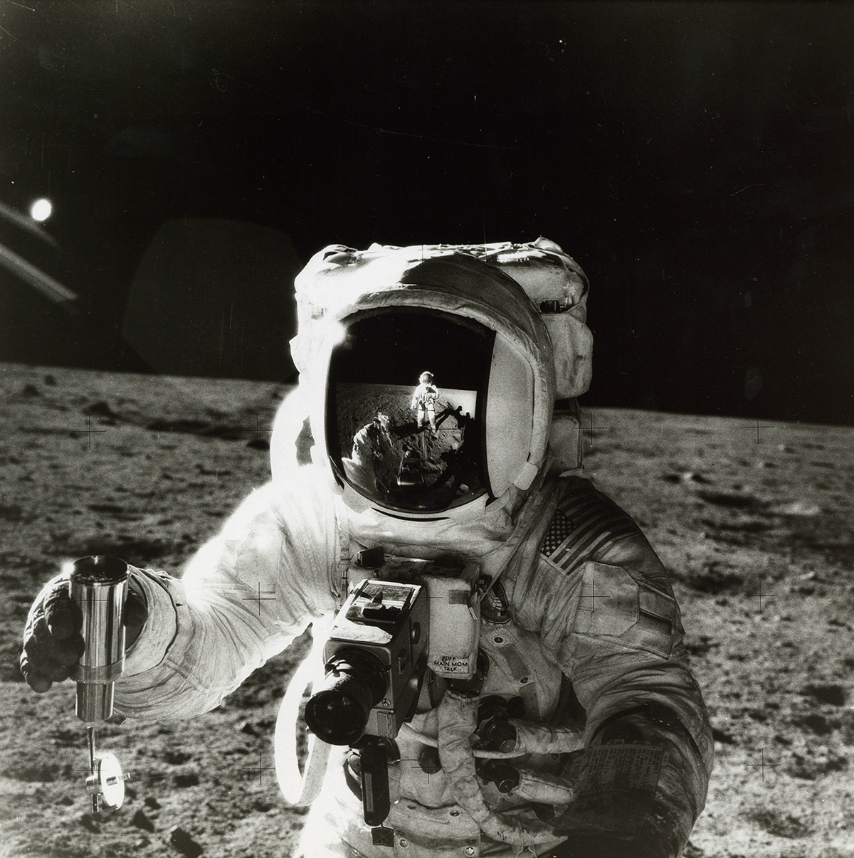 Ο αστροναύτης Αλαν Μπιν πατάει στο φεγγάρι, μετά την προσελήνωση του αεροσκάφους στην αποστολή Απόλλων 12, το 1969. Στην εικόνα φαίνεται και ο φωτογράφος, από το τζάμι της στολής του Μπιν.