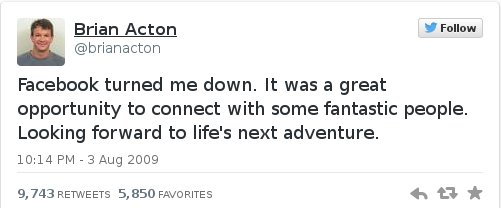 Το Facebook απέρριψε τους προγραμματιστές Μπράιαν Ακτον και Γιαν Κουμ, όταν εκείνοι πέρασαν από συνέντευξη, το 2009. Λίγα χρόνια αργότερα, το Facebook πλήρωσε 19 δισεκατομμύρια δολάρια για το WhatsApp, το οποίο δημιούργησε το δίδυμο μετά από την απόρριψη.