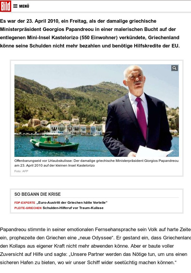 Στο δημοσίευμα γίνεται αναφορά και στον πρώην πρωθυπουργό Γιώργο Παπανδρέου, ο οποίος είχε ανακοινώσει από το Καστελόριζο στον ελληνικό λαό ότι η χώρα μπαίνει στο Μνημόνιο.