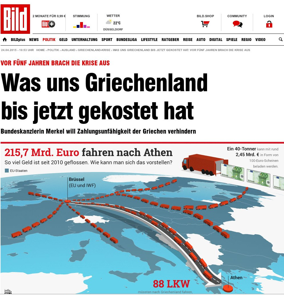 Φυσικά, όμως, η Bild δεν σταματά στην απλή παράθεση των χρηματικών ποσών που δόθηκαν στην Ελλάδα, αλλά επιστρατεύει και τη γνωστή ειρωνική της διάθεση και κάνει τον όλο δανεισμό... εικόνα.