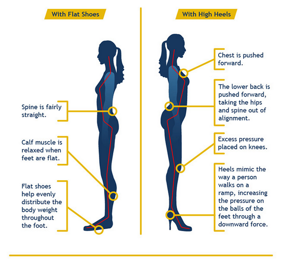 Αντίθετα, όταν φορά κάποια ψηλοτάκουνα, το στήθος πιέζεται προς τα μπρος όπως και το χαμηλό μέρος της πλάτης, βγάζοντας τους μηρούς και τη σπονδυλική στήλη από την ευθυγράμμιση, ενώ ασκείται υπερβολική πίεση στα γόνατα και τους αστραγάλους.