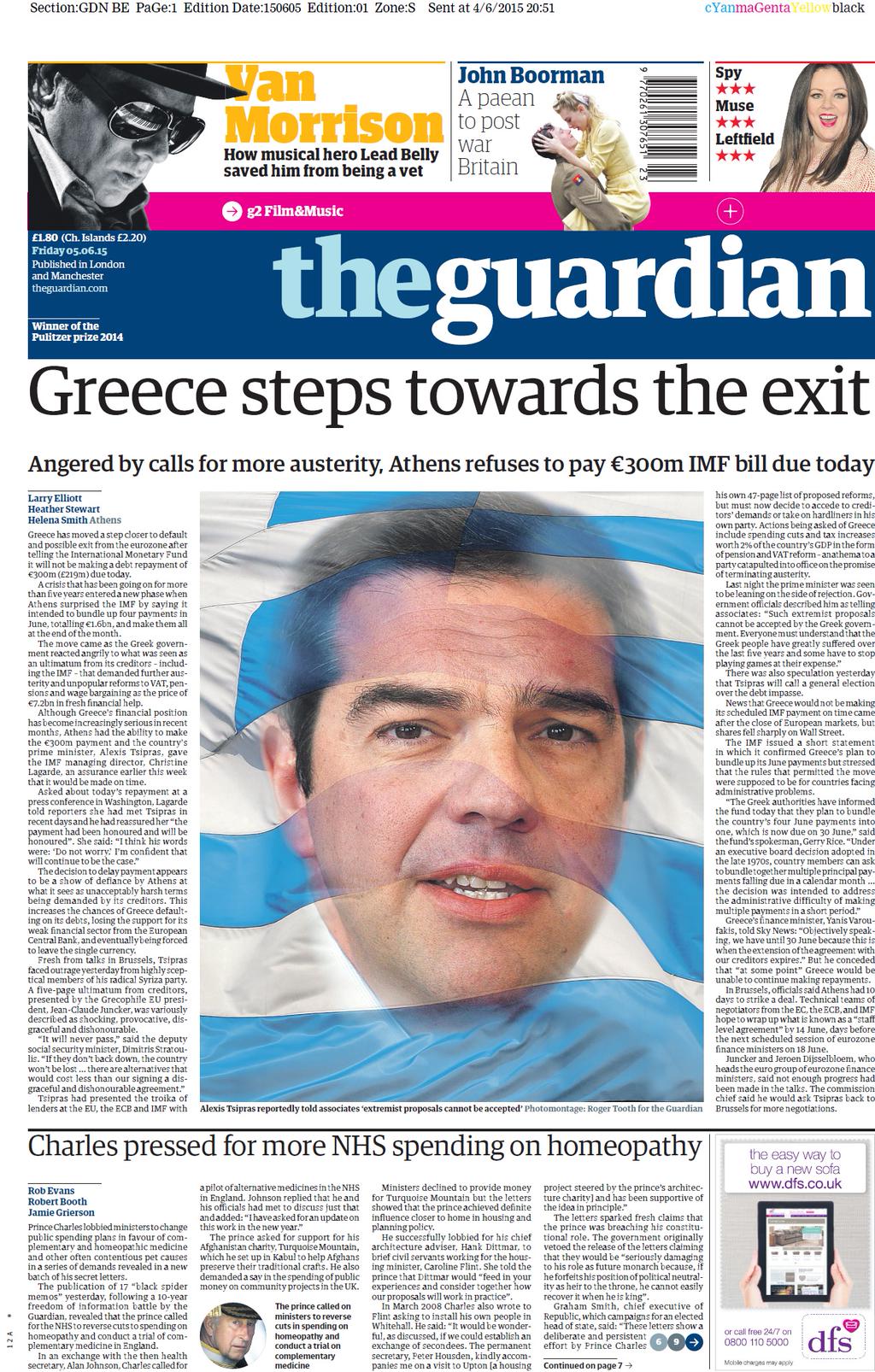 Το πρόσωπο του Αλέξη Τσίπρα, μέσα σε μία ελληνική σημαία, φιγουράρει στο πρωτοσέλιδο του Guardian την Παρασκευή, με τη βρετανική εφημερίδα να γράφει στον τίτλο ότι η Ελλάδα έκανε ένα βήμα προς την έξοδο, καθώς θυμωμένη από τις εκκλήσεις για περαιτέρω λιτότητα αρνείται να πληρώσει τη δόση προς το ΔΝΤ.