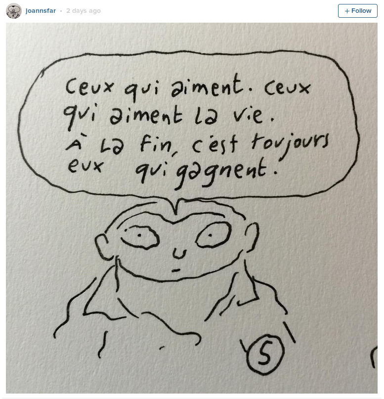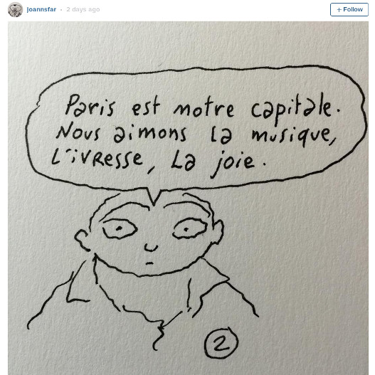 O Joann Sfar, ένας από τους γνωστούς σκιτσογράφους του γαλλικού περιοδικού Charlie Hebdo, που ήταν στόχος των τρομοκρατών τον περασμένο Ιανουάριο, δεν θα μπορούσε να μην σχολιάσει με την πένα του τις επιθέσεις της Παρασκευής...