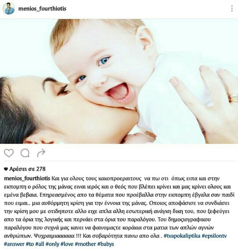 Ο ίδιος είπε: "Είναι ένα δώρο που κάνει ο Θεός στις μανούλες που τους στέλνει παιδιά για να τα μεγαλώσουν με ήθος και αξιοπρέπεια"...Και τελείωσε τον λόγο του με τη φράση "Ο Θεός δεν κάνει λάθος για το ποια θα κάνει μανούλα".